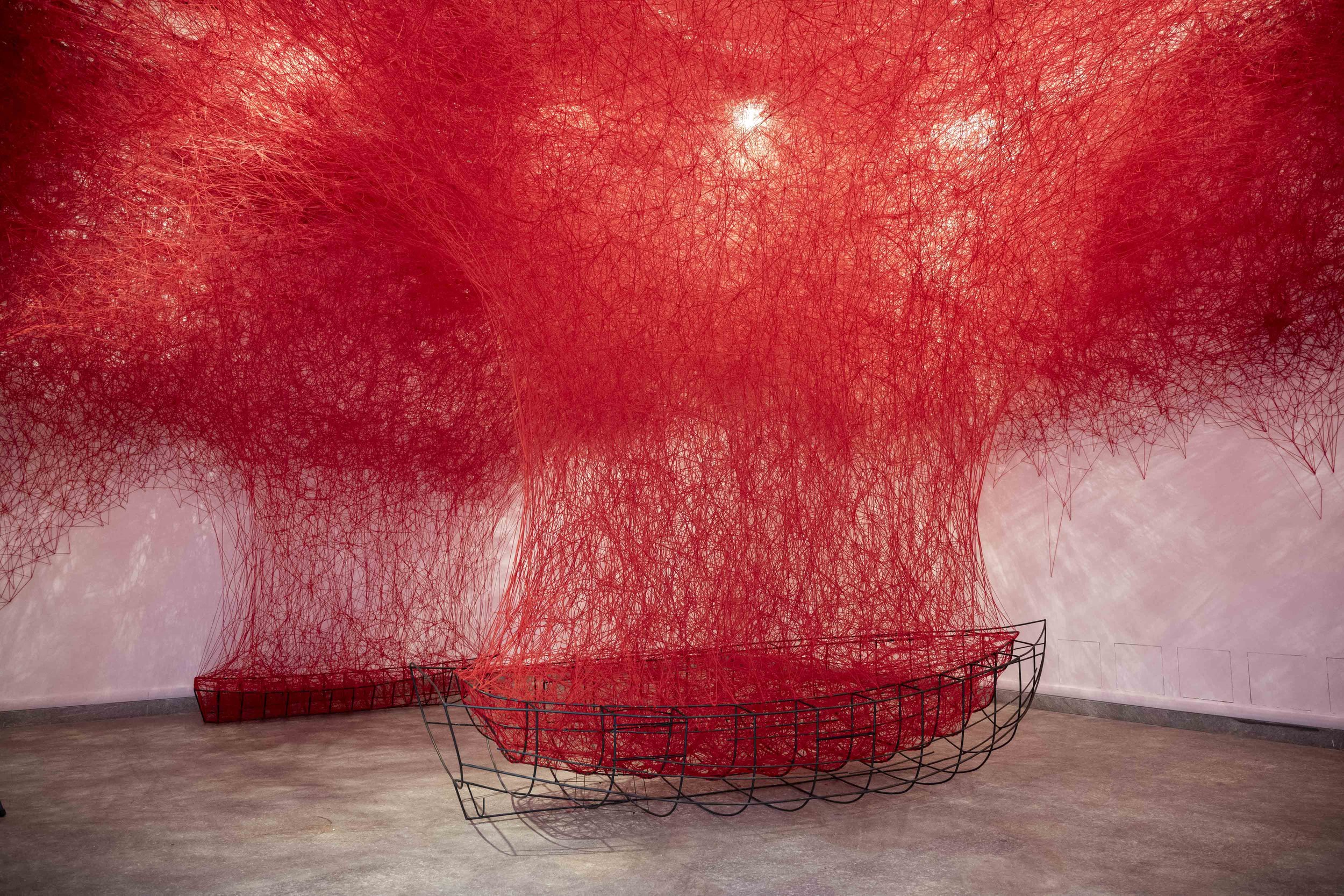 鉄枠、赤い毛糸